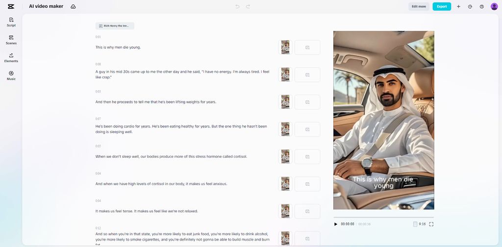 Press "Create" to build your video. Now bring it all together—adjust subtitles to match the flow, choose templates that suit the tone, drag to resize, and head to the "Music" tab to add background tracks. If you want subtitles, voices, and actions perfectly synced, use "Edit more" for advanced effects and filters.